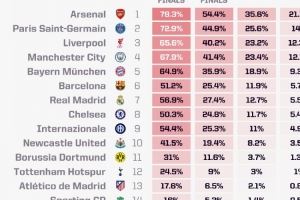 Opta欧冠最新夺冠概率:阿森纳21.13%最高,巴黎、利物浦二三位